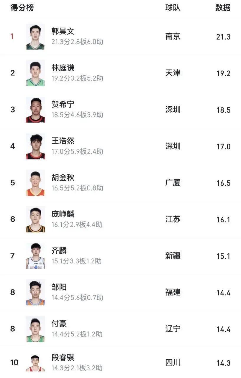 华体会入口-连克北京上海,国内球员得分榜前五占俩,贺希宁王浩然太猛了